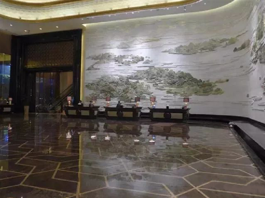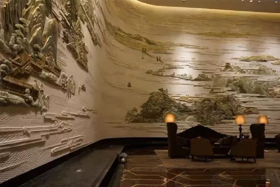 把大堂設計成一幅立體的環(huán)繞式大型山水壁畫(huà)